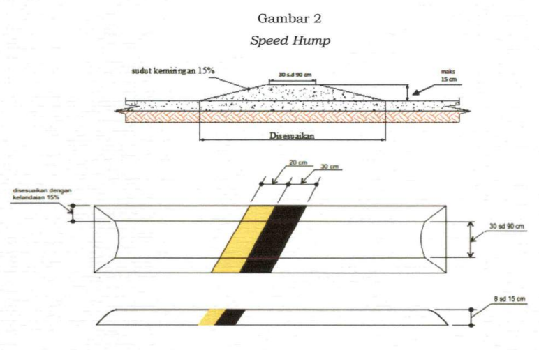 2. Speed Hump Tinggi : 8 cm (delapan sentimeter) sampai dengan 15 cm (lima belas sentimeter) Lebar bagian atas : 30 cm (tiga puluh sentimeter) sampai dengan 90 cm (sembilan puluh sentimeter) Kelandaian paling tinggi : 15% (lima belas persen) Kombinasi warna kuning atau putih berukuran 20 cm (dua puluh sentimeter) sedangkan warna hitam berukuran 30 cm (tiga puluh sentimeter), dengan sudut kemiringan pewarnaan ke kanan sebesar 30 derajat (tiga puluh derajat) sampai dengan 45 derajat (empat puluh lima derajat)