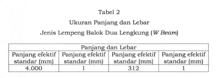 a) Lempeng balok dua lengkung (w beam) adalah komponen yang dipasang sejajar sumbu jalan yang terbuat dari baja profil w dengan ketebalan antara 2,7 mm (dua koma tujuh milimeter) sampai dengan 3,0 mm (tiga milimeter).