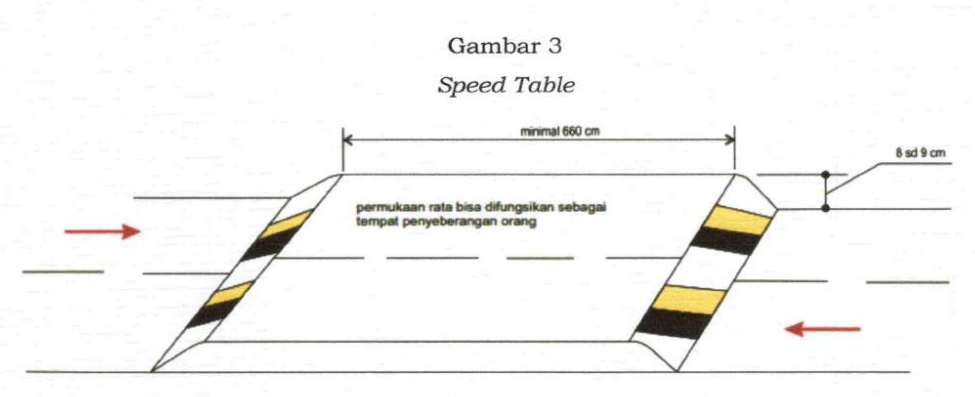 3. Speed Table Tinggi : 8 cm (delapan sentimeter) sampai dengan 9 cm (semiblan sentimeter) Lebar bagian atas : 660 cm (enam ratus enam puluh sentimeter) Kelandaian paling tinggi : 15% (lima belas persen) Kombinasi warna kuning atau putih berukuran 20 cm (dua puluh sentimeter) sedangkan warna hitam berukuran 30 cm (tiga puluh sentimeter)
