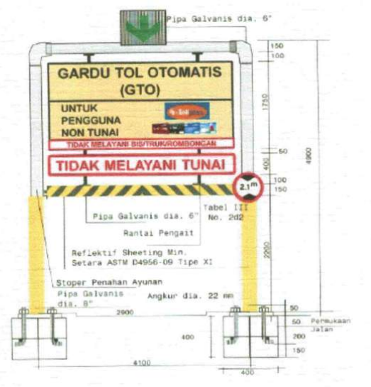 B. Alat Pembatas Tinggi dan Lebar Ukuran Portal pembatas dimensi kendaraan ditetapkan sesuai dengan jenis kendaraan yang akan dibatasi. sebagai contoh gerbang tol khusus pembayaran menggunakan uang elektronik hanya dibatasi untuk kendaraan penumpang dengan ukuran tinggi portal tertulis 2,1 m (dua koma satu meter).