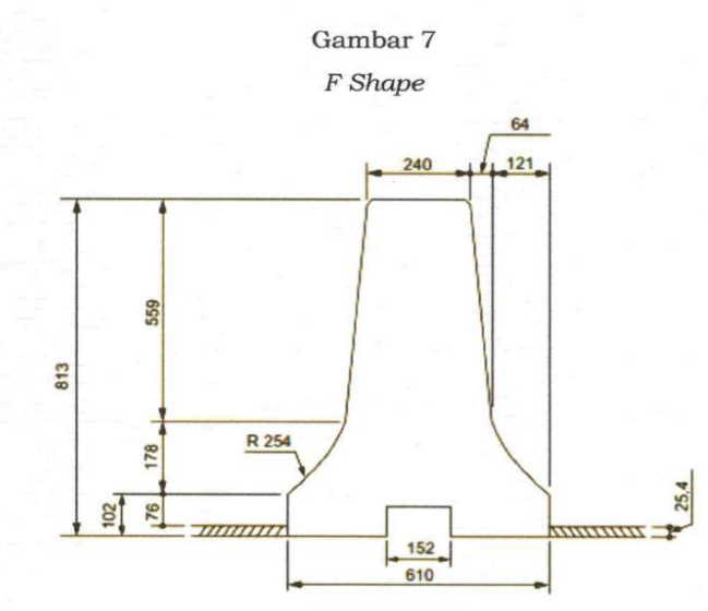 c. F Shape Penempatan Pagar Pengaman kaku jenis F Shape pada jalan dengan kecepatan rata-rata 80 km/jam (delapan puluh kilometer per jam) sampai dengan 100 km/jam (seratus kilometer per jam).