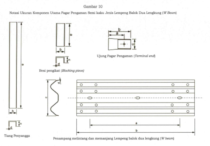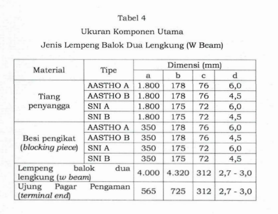Ukuran Pagar Pengaman semi kaku jenis lempeng balok dua lengung (w beam) sesuai dengan SNI dan AASHTO sebagaimana tabel dan gambar di bawah.