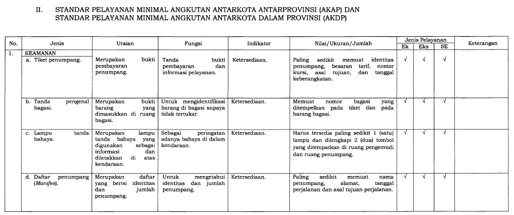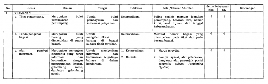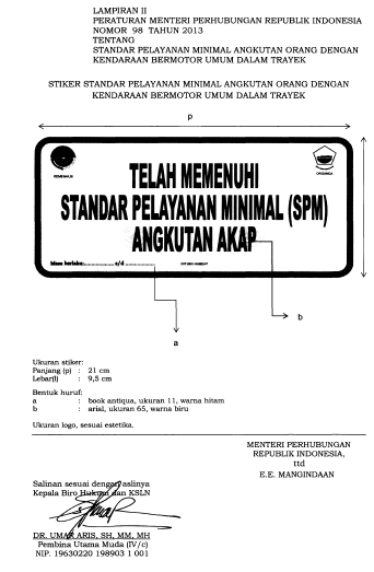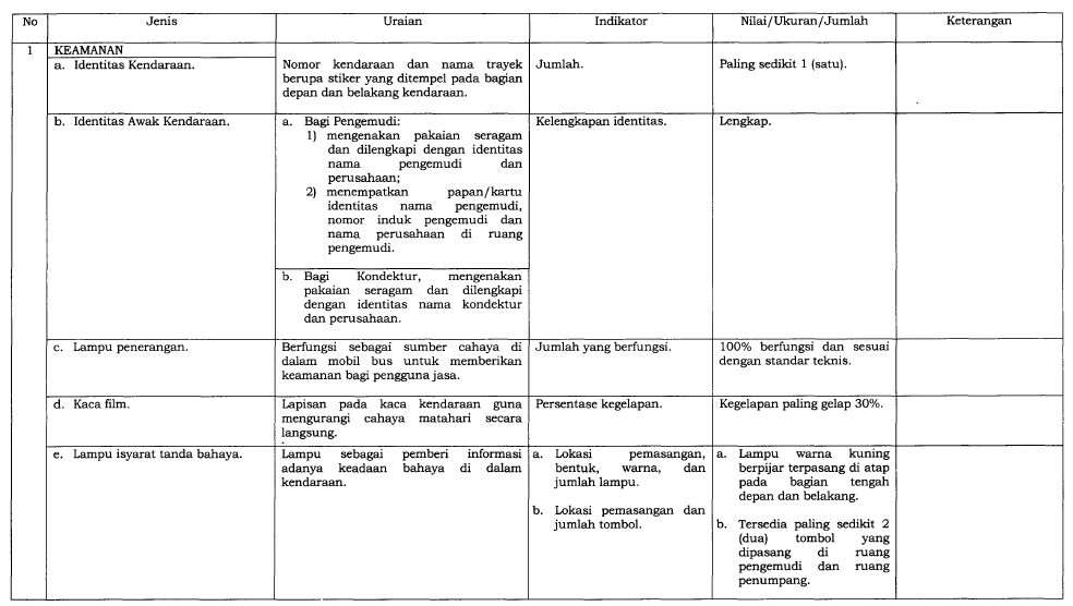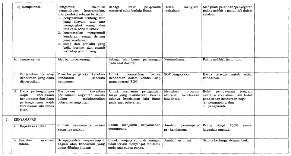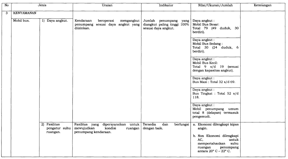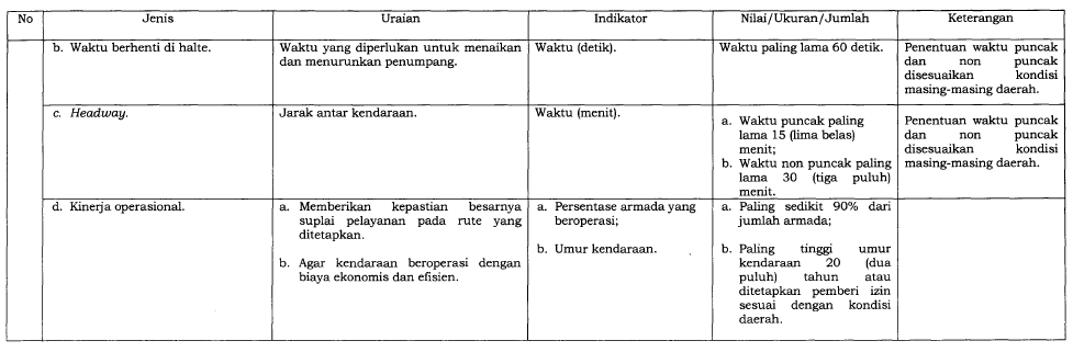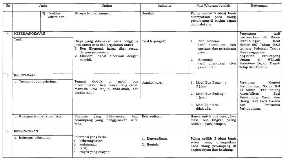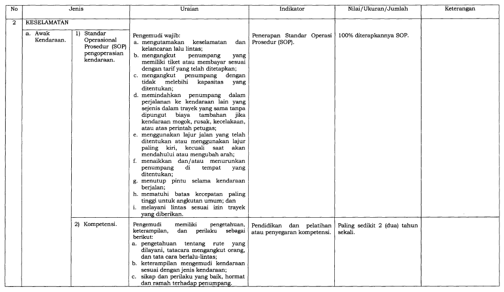 Dalam upaya meningkatkan kualitas layanan transportasi umum di Indonesia, Kementerian Perhubungan menerbitkan Peraturan Menteri Nomor 98 Tahun 2013 tentang Standar Pelayanan Minimal (SPM) Angkutan Orang dengan Kendaraan Bermotor Umum dalam Trayek. Peraturan ini kemudian diperbarui dengan PM No. 29 Tahun 2015, yang menambahkan ketentuan baru guna memperkuat aspek keselamatan dan kenyamanan pengguna transportasi umum.